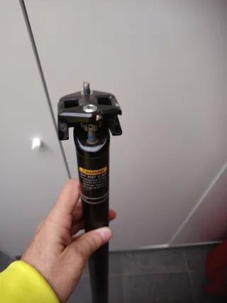 Tija de sillín de bicicleta de color negro. - Mecanismo de sujeción del sillín. - Advertencia de uso en el cuerpo de la tija.