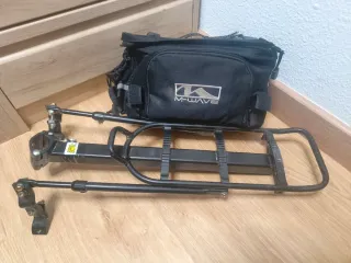 Conjunto de portabultos y mochila/Alforja: -Portabultos con brazos regulables para cualquier tipo de bici rígida. Cierre rápido al tubo de sillin. -Mochila/Alforja con bolsillos laterales plegables con buena capacidad. Sujeccion de velcro y cuerda de transporte. Con muy poco uso,en perfecto estado. No se vende por separado.