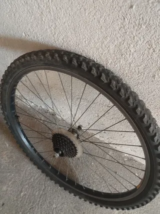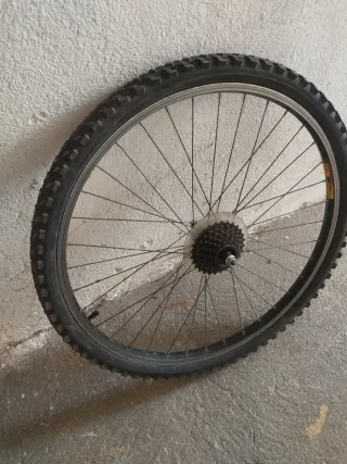 Rueda trasera de bicicleta. - Llanta de aluminio. - Cubierta con tacos para montaña. - Piñonera de varias marchas.. 20€ Sillín, con tija de 2,50diametro.y cierre abrazadera.15€ 👉 Más productos en mi perfil 👍