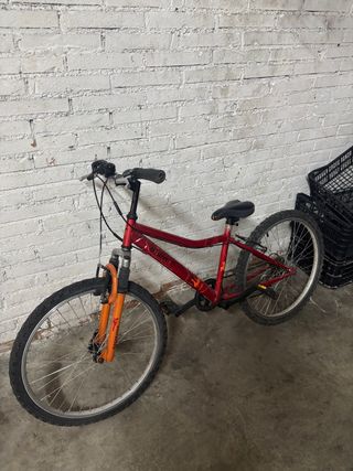 Bicicleta de color rojo, ideal para todo tipo de personas. - Ruedas de 20 pulgadas. - Frenos delanteros y traseros. - Sillín ajustable pero roto, se puede arreglar.