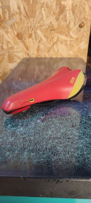 Sillín diseñado por bertone. Parte roja piel y parte amarilla tercipelo. Look 196,Colnago, campagnolo, bianchi...