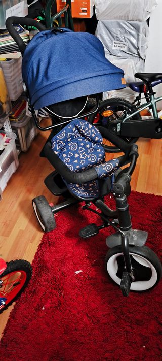 Triciclo para niños de 2 a 4 años, con un diseño moderno y cómodo. - Capota protectora azul. - Asiento acolchado con estampado. - Ruedas resistentes. Con mucho uso, algunas piezas no estan rotas pero si con tipico deteriodo