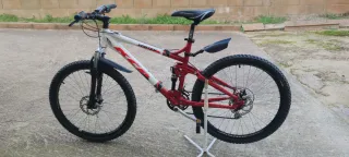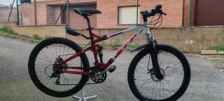 Bicicleta de montaña con cuadro de doble suspensión. Cambio Deore Lx 8 piñones x3. Manillar carbono. - Cuadro de aluminio en colores rojo y blanco. - Ruedas de 26 pulgadas. - Frenos de disco. - Suspensión delantera y trasera.