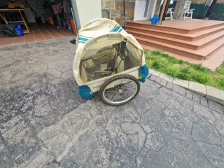 Remolque de aluminio para transportar niños. - Estructura ligera y resistente. - Rueda delantera de gran tamaño. - Cubierta protectora con malla.