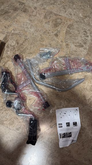 Portabicicletas para coche de la marca Btwin de Decathlon. Diseñado para transportar bicicletas de forma segura. - Estructura metálica negra. - Soportes para bicicletas con recubrimiento azul. - Correas de sujeción azules con logo. - Incluye un elemento de seguridad rojo.