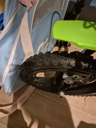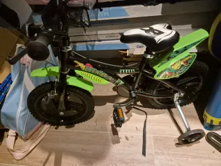 Bicicleta infantil con diseño de dinosaurios. Solo tiene un rasguño en el cuadro por el transporte. - Guardabarros delantero y trasero en color verde. - Ruedines de apoyo. - Sillín con diseño. - Cadena protegida.