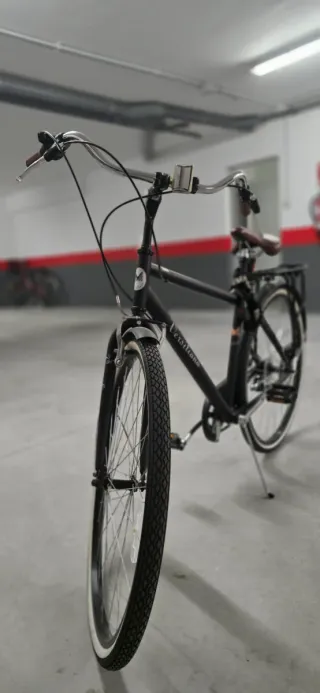 Bicicleta Versiliana de color negro con detalles en blanco en las ruedas. - Cuadro de bicicleta. - Ruedas con banda blanca. - Sillín marrón. - Portaequipajes trasero.