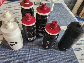 Lote de siete bidones para agua, ideales para ciclismo. - Varios colores y marcas. - Tapones de rosca.
