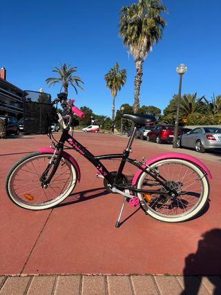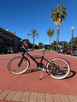 B'TWIN Original 500 de 20 pulgadas, diseñada para niños de 6 a 9 años. -Color: Negra con detalles y guardabarros rosas. -Tamaño de rueda: 20 pulgadas, ideal para niños que miden entre 120 y 135 cm. -Características: Equipada con 6 velocidades para adaptarse a diferentes terrenos, cesta delantera y caballete. Peso: Aproximadamente 12,8 kg. tiene linterna y timbre en el manillar