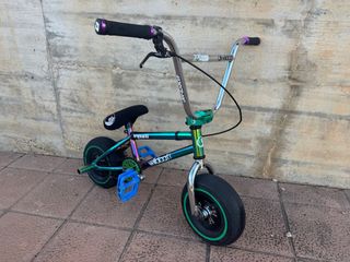 Bicicleta BMX Wildcat Original 2 con un diseño llamativo. - Cuadro de color iridiscente. - Manillar cromado. - Pedales azules. - Ruedas con aro verde.