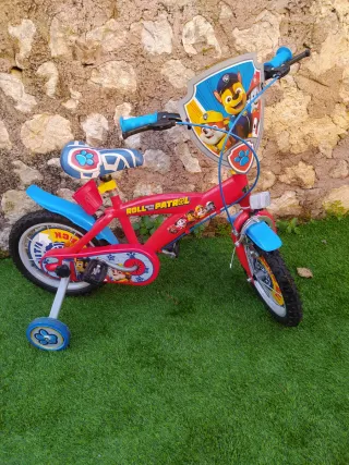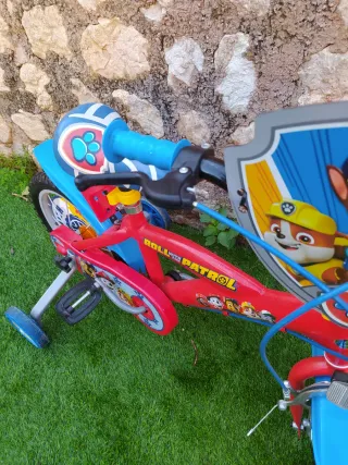 Bicicleta infantil con diseño de la Patrulla Canina. - Color principal rojo con detalles azules. - Ruedines de apoyo incluidos. - Protector de cadena. - Manillar con escudo decorativo de la Patrulla Canina. Como se ve en una de las fotos, le puse una arandela porque uno de los plàsticos de los pedales se movia. Funciona correctamente.
