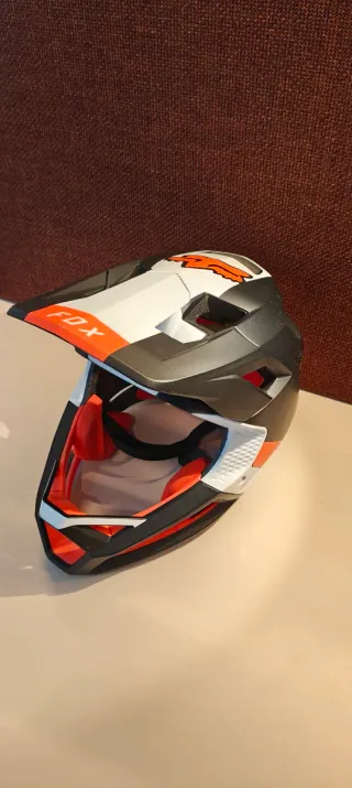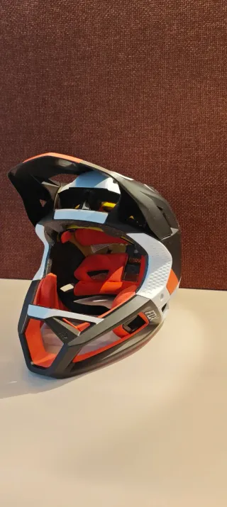 Casco integral Fox Profame en color negro, blanco y naranja. Diseñado para la máxima protección. - Diseño aerodinámico. - Interior acolchado para mayor comodidad. - Sistema de ventilación.