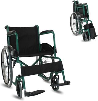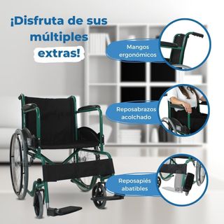 Silla de ruedas Mobiclinic® de color verde y negro, diseñada para ser autopropulsable. TIENE LA RUEDA IQUIERDA GRANDE DOBLADA - Estructura metálica resistente. - Asiento y respaldo de tela. - Reposapiés ajustables. - Ruedas traseras grandes y ruedas delanteras giratorias.