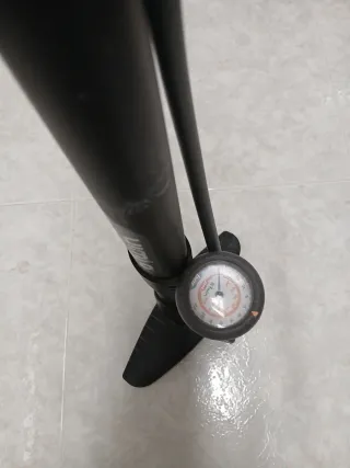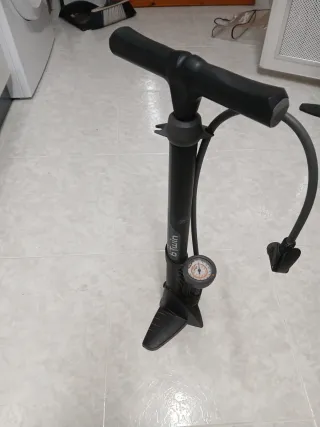 Bomba de pie para bicicleta de la marca Btwin. Incluye manómetro para controlar la presión. - Diseño ergonómico con mango en T. - Base estable para un uso cómodo. - Manguera flexible con cabezal. - Manómetro integrado.