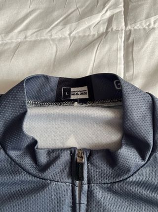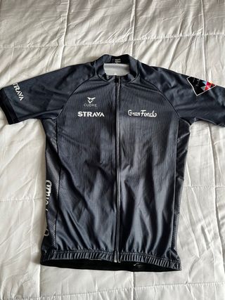 Maillot ciclismo de manga corta con diseño moderno Talla L - Color gris oscuro. - Logos de Strava y Gran Fondo. - Detalle de panel lateral texturizado. - Cremallera frontal completa.