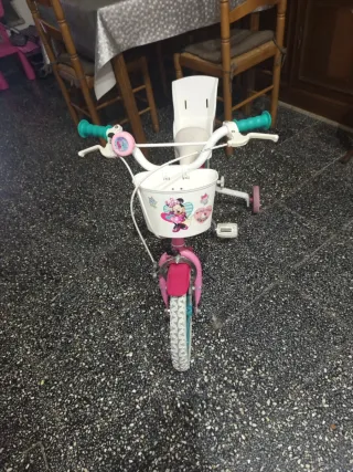 Bicicleta de niña con diseño de Minnie Mouse. - Color rosa. - Incluye cesta delantera. - Sillín trasero. - Ruedines de apoyo.