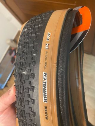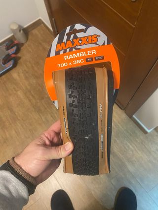 Cubierta Maxxis Rambler para gravel, con un tamaño de 700x38C. - Diseño de tacos para un buen agarre. - Color marrón en los laterales.