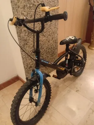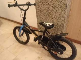 Bicicleta infantil de la marca BTWIN, ideal para los más pequeños. (Vendo por falta de uso, precio negociable) - Color negro y azul. - Ruedas de 16 pulgadas. - Sillín negro con detalles blancos. - Ruedines
