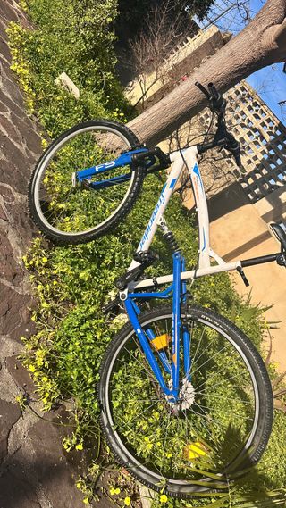 Bicicleta de montaña en color plateado, azul y negro, lista para tus aventuras. - Cuadro de aluminio. - Ruedas todoterreno. - Portabidón incluido. La bicicleta casi no se ha usado.