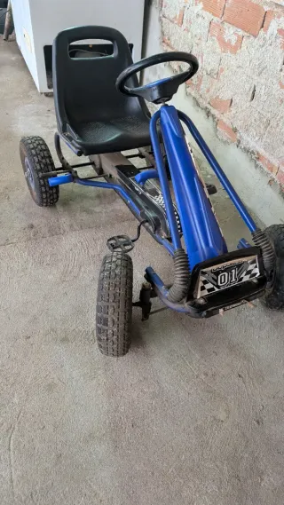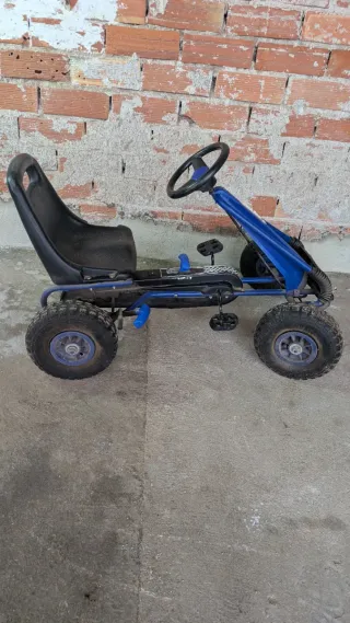 Coche a pedales de color azul, perfecto para que los niños disfruten al aire libre. Había una rueda pinchada y también un plastiquito mordido, de ahí el precio rebajado. - Asiento ergonómico. - Ruedas todoterreno. - Volante para dirigir. - Freno de mano No envío . . juego, juguete, carreras, competición, triciclo, moto, a batería