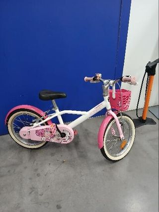 Bicicleta infantil de la marca Btwin, ideal para los más pequeños. Su diseño combina el color blanco con detalles en rosa. - Ruedas de 16 pulgadas. - Frenos de mano. - Incluye ruedines de aprendizaje. - Sillín y manillar ajustables.
