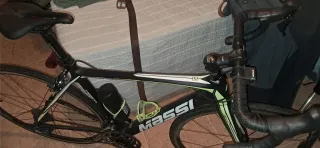 Bicicleta de carretera Massi con cuadro negro y detalles en verde y blanco. Incluye portabidón. - Cuadro de carbono. - Manillar de carretera. - Ruedas de carretera.