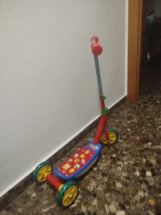 Patinete infantil con diseño de Mario Bros, ideal para los más pequeños. Cuenta con tres ruedas para mayor estabilidad. - Manillar ajustable en altura. - Ruedas de colores. - Plataforma antideslizante. Como se aprecia en las fotos las ruedas están perfectas, casi no ha rodado. Lo único que la pegatina del manillar está un pelín deteriorada, pero no afecta a su uso