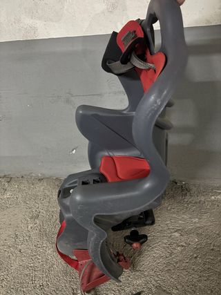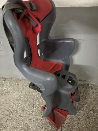 Silla para transportar niños en bicicleta, de color gris con detalles en rojo. - Diseño ergonómico. - Cinturón de seguridad ajustable. - Reposapiés integrado.