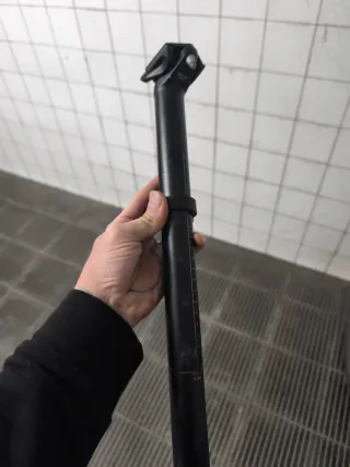 Tija de sillín telescópica de la marca KS Kind Shock. 31.6x445x125 Fabricada en aluminio negro. Está en buen estado. Lo único que no regresa inmediatamente arriba. Es reparable.