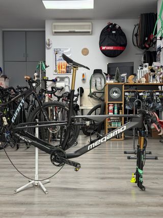 Cuadro de bicicleta de montaña Megamo. - Material: Carbono - Color: Negro - Modelo: Track talla L a estrenar -Suspensión trasera a estrenar -Potenciómetro Quarq,tranmisión, plato y cadena, cambio Sram AXS electrónico -Tija telescópica a estrenar -Manillar Gemini -Frenos Magura Manetas de carbono