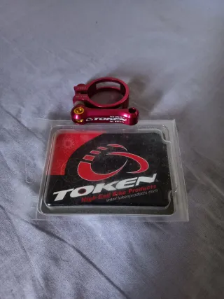Cierre para tija de sillín de la marca Token. - Fabricado en aluminio 7075 CNC. - Diámetro de 34.9 mm. - Color rojo. - Incluye tornillería dorada. Y pegatinas de la marca