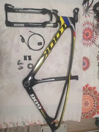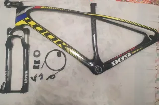 Conjunto de cuadro de carbono LOOK 989 para bicicleta de montaña de 29 pulgadas, junto con horquilla RockShox. - Cuadro de carbono. - Rueda de 29 pulgadas. Cableado por interior. Diseño con detalles en amarillo y rojo.se incluye pedalier shimano direccion,potencia,eje pasante trasero de 12x142mm y cierre tija ,talla m/l incluye horquilla rockshox reba de aire en muy buen estado. Fox,renthal,roval,kashima,hope,intense,m9,m16,m29,carbono,specialized,fox 40,santa cruz v10,enduro,mtb shimano,xt,deore,saint,fox,progress,trail,mondraker,dh,desenso,frerider,sword,fox,trek