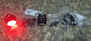 Lote de accesorios para bicicleta. - Luz trasera roja led, varias secuencias,con pila. - Timbre electrónico para bicicleta marca ROCKBROS,90 dB 3 tipos de timbre ,resistenteal agua IPX5,con pilas nuevas y funcionando - Contrapeso o tope para manillar marca Dancaro - Conjunto valvula fina. Abrazadera tija sillin de cierre rápido.