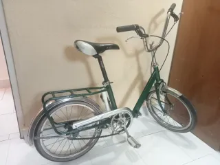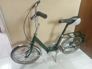 Bicicleta plegable vintage. Elegante y robusta, made in Eibar. Orbea OCI (posterior a 1969, por tanto), pero con horquilla compatible BH (ver fotos anteriores a la restauración). Lista para usar: frenos, puños, cámaras, sillín y tija nuevos; cuadro, protector de catalina y guardabarros recién lijados / pintados. Pata de cabra para mantenerse de pie. Defectos: tornillo del perno del manillar un poco torcido; marcas de óxido en el mismo lugar (ver fotos); inflador original, pero que no funciona (se incluye como adorno).