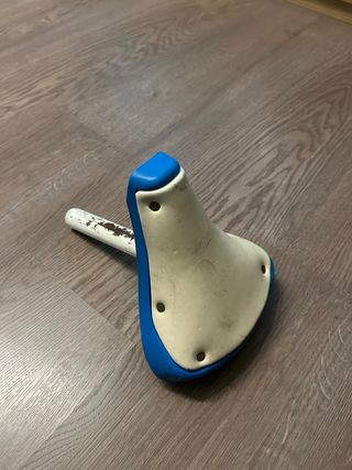 Sillín de bicicleta clásica BH pequeña 14” con tija de 24mm azul y blanco usado con sus roces y heridas de guerra pero perfectamente funcional. Palabras clave/Vintage/Antigua/BMX/ California/X2/X3/X4/X5/Sky/Monty/Florida/Weinman/Bicicross/Motoretta/Torrot/Mongosse/Panther/Derbi/Rabasa/XL2/XL3/XL4/star/Orbea/BH/G.A.C/Montesita/Mag/trickstyle/kuwahara/Peugeot/Skyway/Akimoto/crosseta/AKM4/Old/School/Notario/Ambrosio/Hi-tech/Aeroyal/ Son piezas recuperadas de bicicletas clasicas o antiguas, pueden tener mas defectos que no se vean.