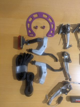 Conjunto de piezas de repuesto Shimano para bicicleta. - Manetas de freno. - Frenos V-Brake. - Tija de sillín. - Puños de manillar.