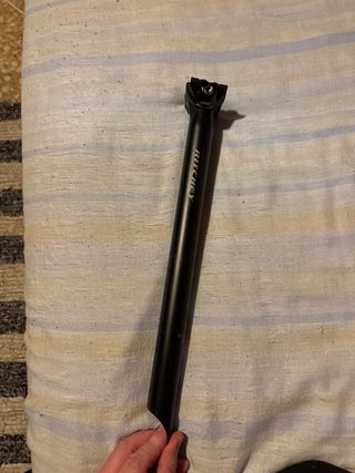 Tija de bicicleta de aluminio de la marca Canyon. Está en buen estado, con algunas marcas de uso. - Material: Aluminio - Marca: Canyon Diámetro 27.2 mm y longitud 350 mm, con retroceso. Bastante ligera en aluminio. Estado bueno aunque con uso