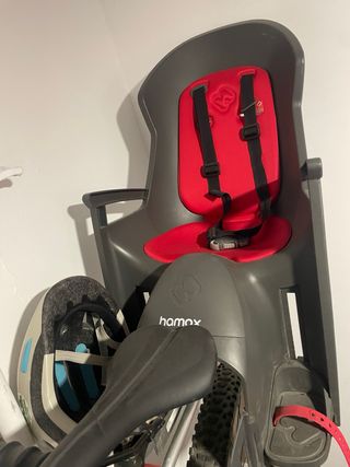Silla portabebés Hamax Smiley para bicicleta. - Color gris y rojo. - Arnés de seguridad. - Reposapiés ajustables. Jujtas 50€ separadas 30€