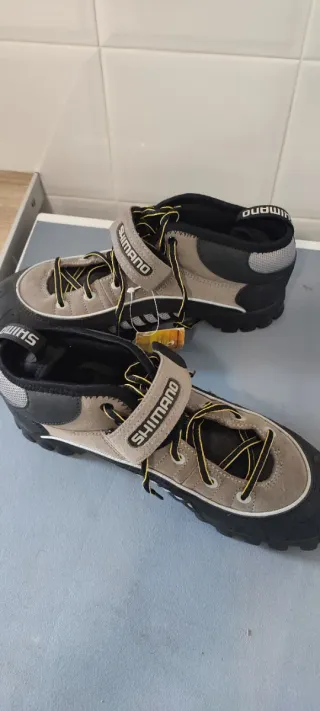 Zapatillas de ciclismo Shimano en color gris y negro con cordones amarillos con - Cierre de velcro. - Suela de goma. - Logo de Shimano en la lengüeta y en la tira de velcro. Están nuevas, son muy cómodas