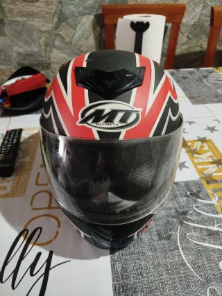 Casco de moto con diseño deportivo y visor. - Color negro, rojo y blanco. - Logo MT Helmets visible.