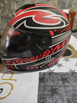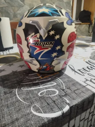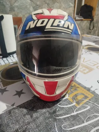Casco integral de la marca Nolan con diseño deportivo. - Color blanco, azul y rojo. - Visera transparente. - Cierre de seguridad.