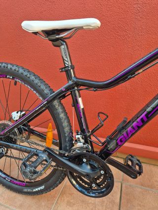 Bicicleta de montaña GIANT con un llamativo diseño en negro y morado. - Cuadro de aluminio. - Ruedas de 27.5 pulgadas. - Frenos de disco. - Horquilla delantera con suspensión. - Puños y sillín en color morado y blanco. Talla S. SOLO PARA RECOGER EN TOLEDO CAPITAL.