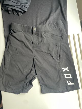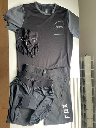 Conjunto de camiseta y pantalón de enduro para niño. - Camiseta negra con mangas grises y logo 100%. Talla XL - Pantalón corto negro con badana y logo FOX. 26 - Guantes negros con detalles blancos. Talla S Para niño/ña de entre 8 y 12 años según complexion
