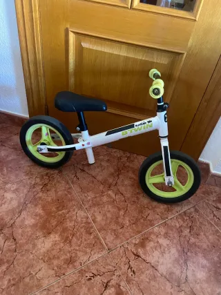 Bicicleta de aprendizaje Btwin Runride en color blanco y verde lima. - Marco de acero. - Ruedas de 10 pulgadas. - Sillín ajustable en altura. - Puños de goma para un mejor agarre.