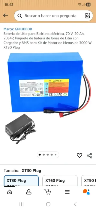 Batería de litio para bicicleta eléctrica de 70V y 20Ah. Incluye cargador y BMS. - Modelo: 20S4P. - Diseñada para kits de motor de menos de 3000W. - Conector: XT30 Plug.