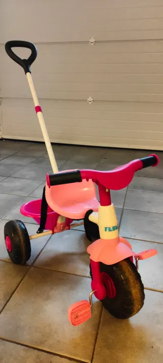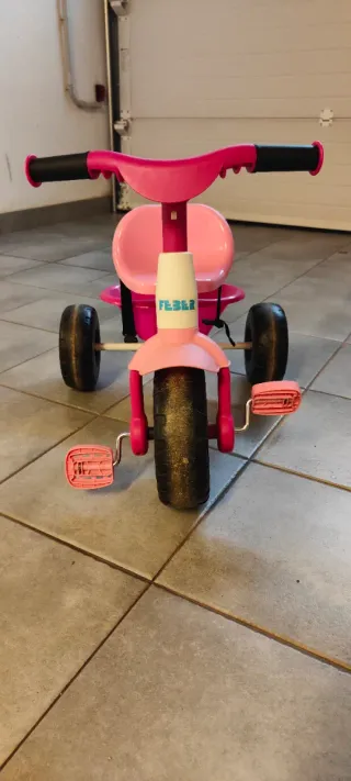 Triciclo de la marca Feber en color rosa. - Manillar con puños negros. - Asiento ergonómico. - Pedales delanteros. - Empujador trasero desmontable. Se dispone de dos unidades.
