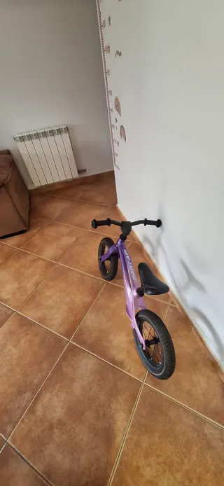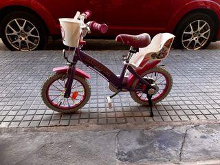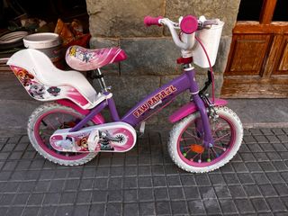 Bicicleta infantil con diseño de la Patrulla Canina. - Color morado y rosa. - Cesta delantera. - Sillín y asiento trasero. - Ruedines incluidos. está perfecta vendo porque le quedó pequeña se usó muy poco