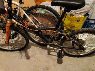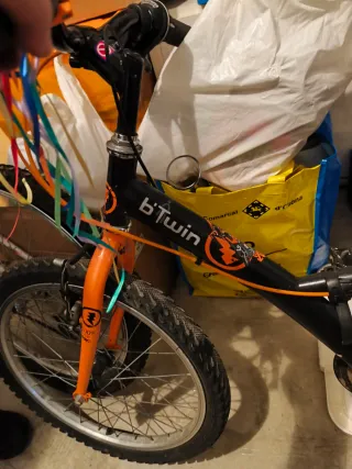Bicicleta infantil de la marca Btwin, ideal para los más pequeños. - Cuadro de color negro y naranja. - Ruedas de 20 pulgadas. - Sillín negro. - Pedales negros.