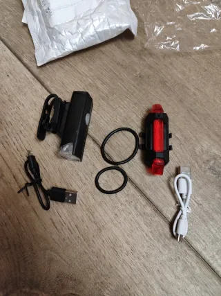 Set de dos luces LED para bicicleta, completamente nuevas. - Luz frontal blanca. - Luz trasera roja. - Incluye cable de carga USB. - Incluye cintas de sujeción. Luz delantera y luz trasera para bicicleta tiene varios modos de iluminacion con cable USB para carga Nueva a estrenar Puedes mirar en mi perfil mas ofertas gracias