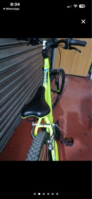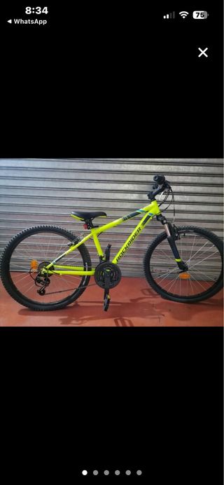 Bicicleta infantil Rockrider en color verde lima, con llanta de 24 pulgadas. Casi nueva y en excelente estado. - Cuadro de aluminio ligero. - Suspensión delantera. - Frenos de disco. - Cambio Shimano de 7 velocidades.
